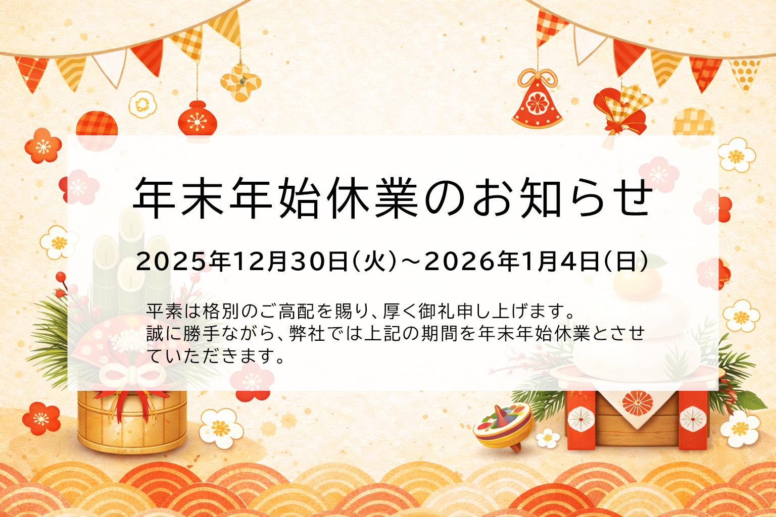 平素は格別のご高配を賜り、厚く御礼申し上げます。 誠に勝手ながら、弊社では下記の期間を年末年始休業とさせていただきます。 <営業> 休業期間: 2025年12月30日(火)~2026年1月4日(日) ご不便をお掛けいたしますが、何卒よろしくお願い申し上げます。